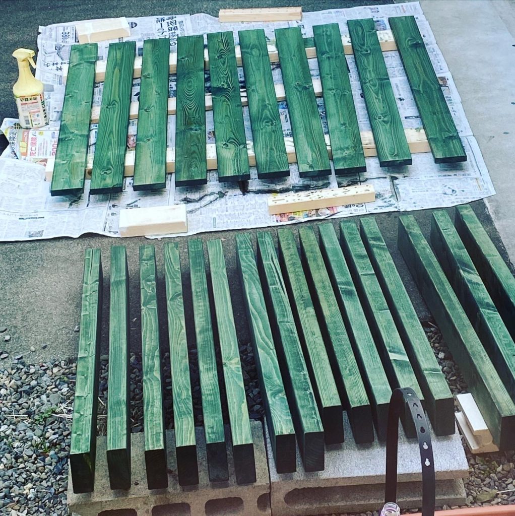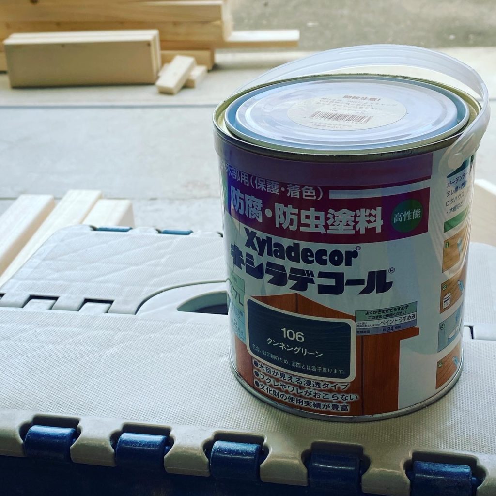 屋外なので防腐・防虫用の塗料「キシラデコール」の106タンネングリーンを全てに塗布。